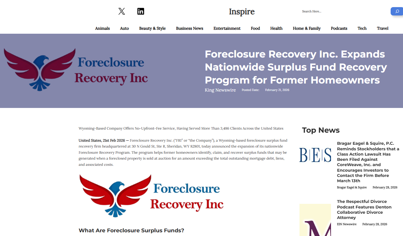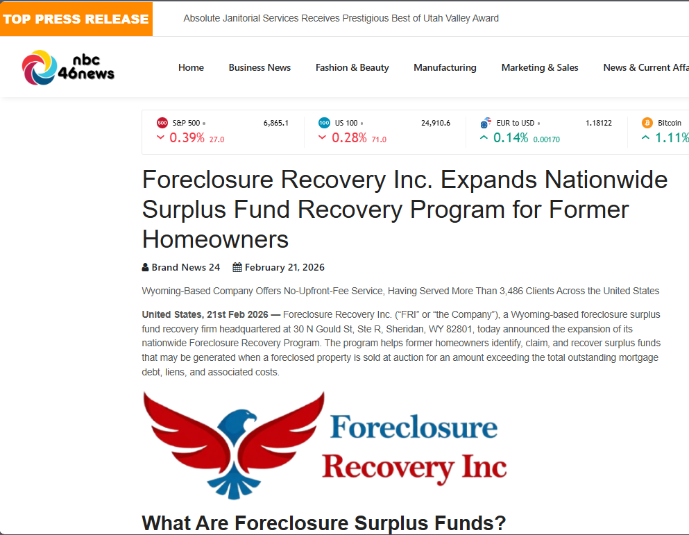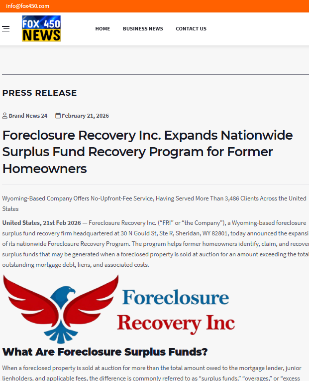 SHERIDAN, WY — February 9, 2026 — Foreclosure Recovery Inc. ("FRI" or "the Company"), a Wyoming-based foreclosure surplus fund recovery firm headquartered at 30 N Gould St, Ste R, Sheridan, WY 82801, today announced the expansion of its nationwide Foreclosure Recovery Program, a comprehensive, legally compliant initiative designed to help former homeowners across the United States identify, claim, and recover surplus funds generated when their foreclosed properties were sold at auction for amounts exceeding the total outstanding mortgage debt, liens, and associated costs. The program operates under the legal framework established by decades of state statutory law and reinforced by the unanimous United States Supreme Court decision in Tyler v. Hennepin County, 598 U.S. 631 (2023), which held that government retention of surplus equity from foreclosure sales constitutes an unconstitutional taking under the Fifth Amendment's Takings Clause.